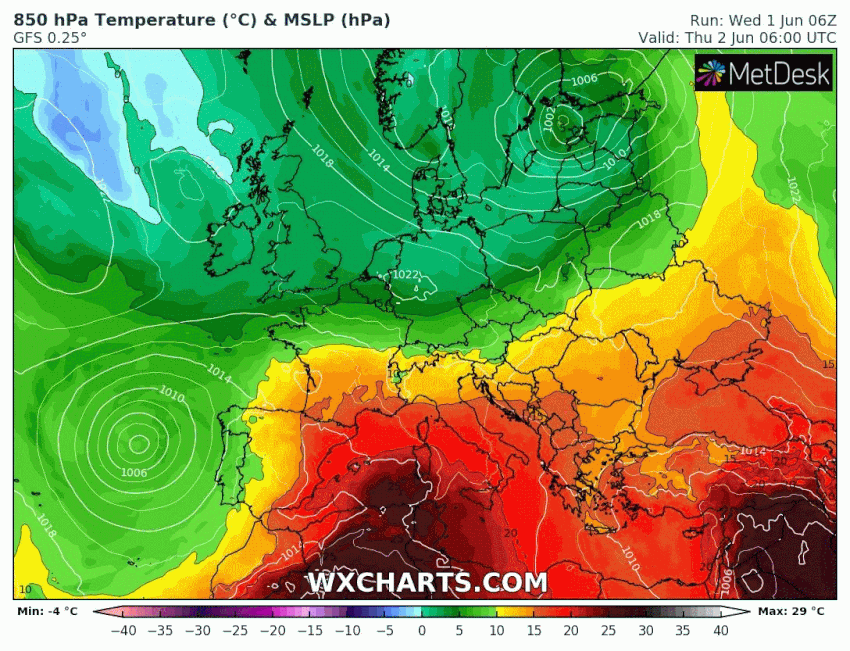 L'animation des masses d'air ci-dessous permet de mettre en évidence ce conflit entre l'air très chaud sur la Méditerranée - débordant assez largement sur le sud et l'est de la France - et l'air océanique sensiblement plus frais situé sur les Îles Britanniques et le proche-Atlantique. Ce dernier ne s'enfoncera véritablement sur la France que durant les journées du dimanche 5 (pour l'ouest) et du lundi 6 juin 2022 (pour l'est). D'ici là, le contexte sera très propice aux orages sur notre pays.
