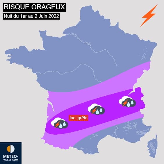 Une première salve orageuse est à prévoir dans les prochaines heures. Les orages devraient se multiplier à la nuit tombée et durant cette nuit du 1er au 2 juin 2022 sur un axe allant des Landes jusqu'aux Savoies. Ces orages seront associés à de fortes pluies et à quelques chutes de grêle localisées, restant généralement modérés.