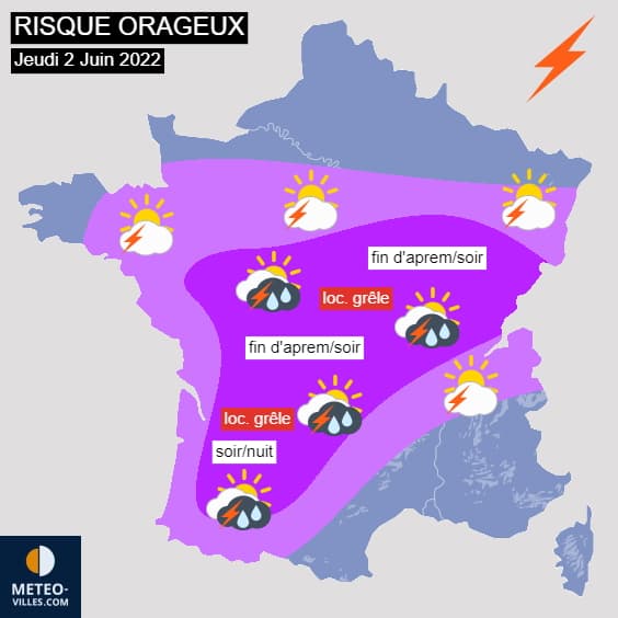 En journée du jeudi 2 juin 2022, le risque orageux va s'étendre. C'est en fin d'après-midi et soirée qu'ils s'annoncent le plus marqué sur les régions centrales avec la possibilité de grêle localement. Plus tard dans la soirée et jusqu'en nuit suivante, le sud-ouest sera également exposé à un risque d'orages forts avec là aussi une menace de grêle sous les cellules les plus actives.