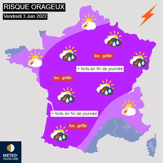 L'instabilité orageuse va s'accentuer et s'étendre durant la journée du vendredi 3 juin 2022. Les orages resteront assez locaux en journée mais devraient se multiplier à compter de la fin d'après-midi et notamment en soirée, perdurant jusqu'en nuit suivante. C'est entre le sud-ouest et le nord-est en passant par les régions centrales qu'ils s'annoncent les plus actifs, pouvant produire des pluies intenses et des chutes de grêle.