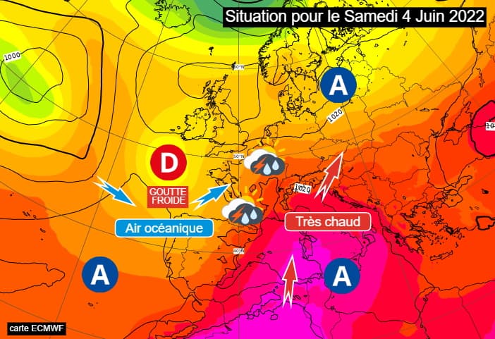 Entre un air chaud venu de Méditerranée et des anomalies dépressionnaires associées à de l'air frais sur le proche-Atlantique, le contexte sera idéal au développement des orages pour la fin de semaine et le premier week-end de juin 2022.