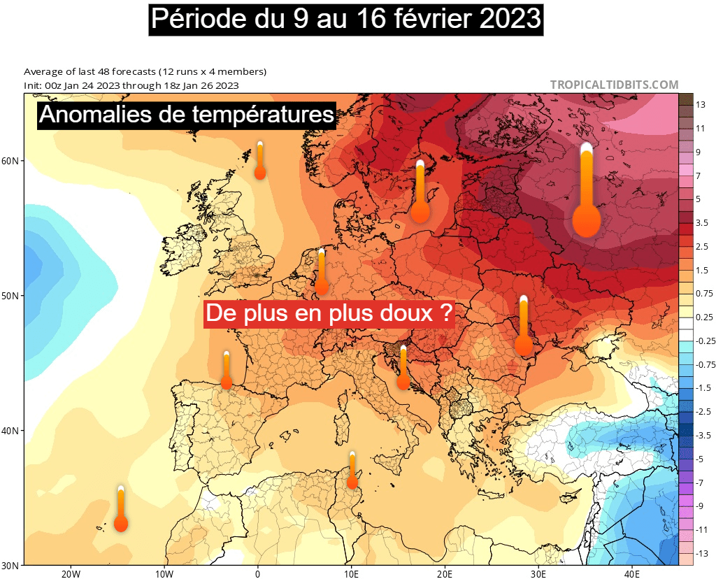 Anomalies de températures sur l'Europe pour la période du 9 au 16 février 2023 - Modèle CFS via TropicalTidBits