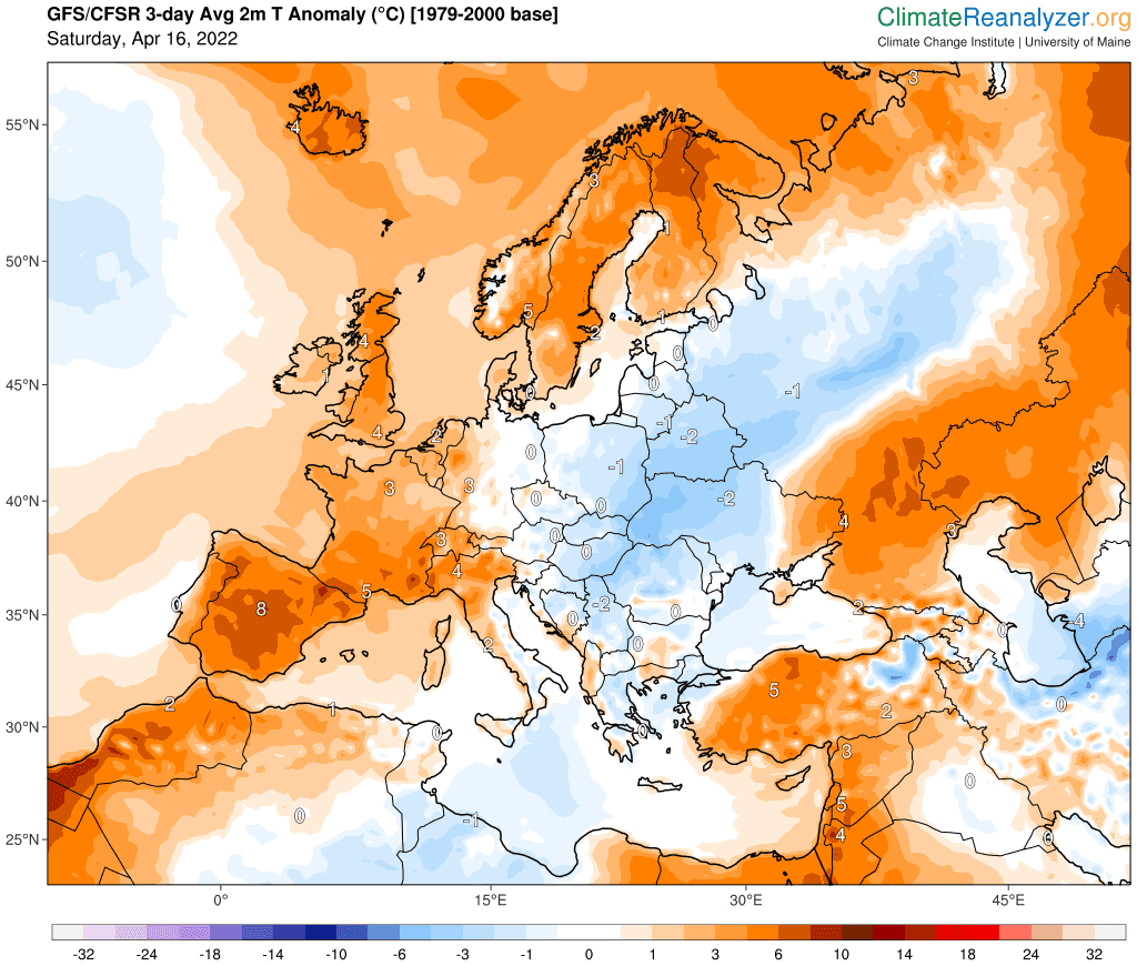 Anomalie de température prévue entre samedi 16 et lundi 18 avril 2021 - ClimateReanalyzer