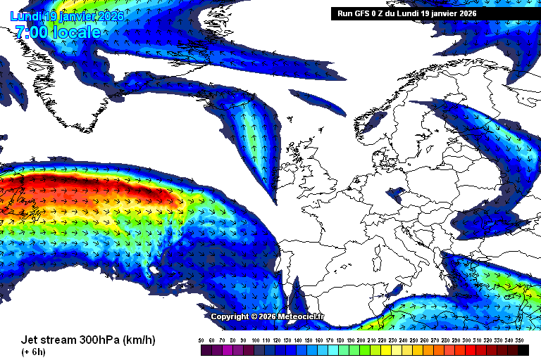Animation du courant jet sur l'Europe du 19 au 27 janvier 2026 – GFS via meteociel.fr
