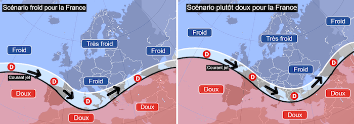 Or, le courant jet marque en général la délimitation entre les masses d'air doux/chaud subtropicales qui se situent au sud de celui-ci et les masses d'air froid polaires qui se trouvent au nord de celui-ci. De ce fait, si celui-ci s'oriente vers la Méditerranée, la France se situera donc au nord de ce fort vent d'altitude, ce qui devrait donc permettre à de l'air plus froid venu du nord du continent de s'écouler vers notre pays.