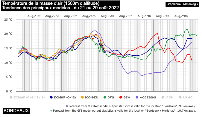 Température de la masse d'air (à 1500m d'alt) à BORDEAUX - tendance des principaux modèles du 21 au 29 août 2022 - Meteologix