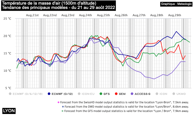 Température de la masse d'air (à 1500m d'alt) à LYON - tendance des principaux modèles du 21 au 29 août 2022 - Meteologix