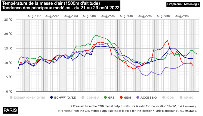 Température de la masse d'air (à 1500m d'alt) à PARIS - tendance des principaux modèles du 21 au 29 août 2022 - Meteologix