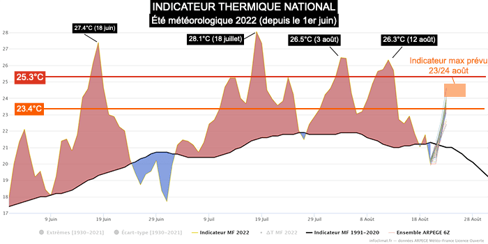 Indicateur thermique national - observations du 1er juin au 19 août 2022 et tendance du modèle d'ensemble Arpège - Infoclimat