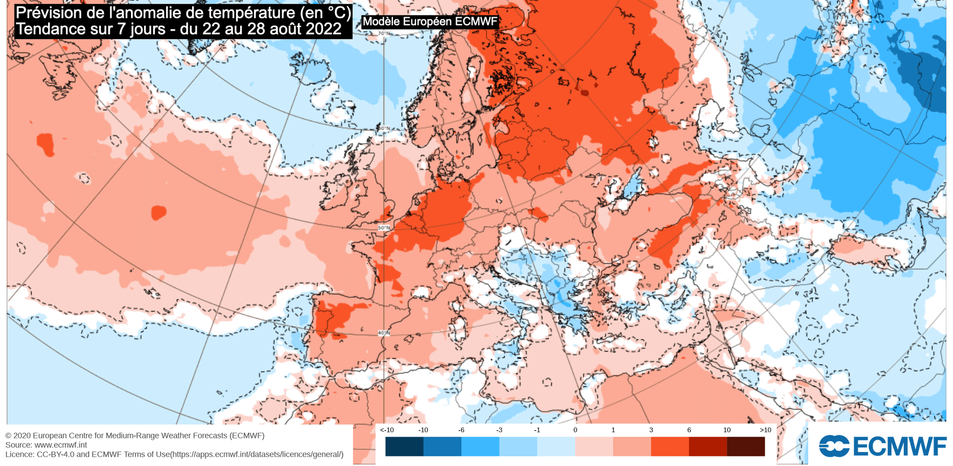 Anomalie de température prévue - Tendance sur 7 jours du 22 au 28 août 2022 - EMCWF