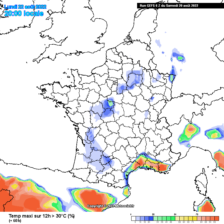 Probabilité de dépassement des 30°C - du lundi 22 au vendredi 26 août 2022 - Ensembliste GEFS via Meteociel
