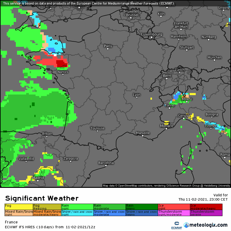 Animation des précipitations le vendredi 12 février 2021 (bleu = neige, rouge = verglas) - modèle CEP via meteologix