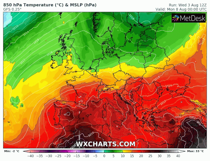Masse d'air à 850 hPa (vers 1500m) du lundi 8 au dimanche 14 août 2022 - via wxcharts.com