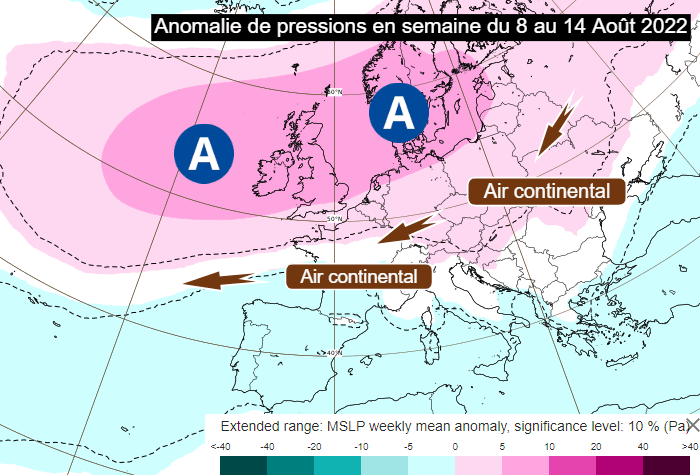 Un blocage anticyclonique dominera une bonne partie de la semaine prochaine (du 8 au 14 août 2022). Ce dernier va se positionner du proche-Atlantique jusqu'à la Mer Baltique en passant par les Îles Britanniques et la Mer du Nord, positionnant la France sous un flux continental très sec avec un soleil restant plus que généreux. Seuls quelques orages pourront se déclencher à proximité des reliefs du sud.