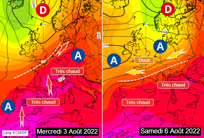 Situation à échelle continentale les mercredi 3 et samedi 6 août 2022 - via ECMWF