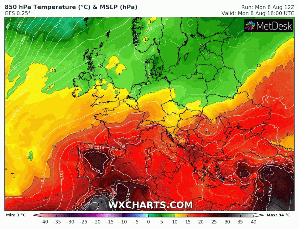 Masse d'air à 850 hPa (vers 1500m) du lundi 8 au dimanche 14 août 2022 - via wxcharts.com