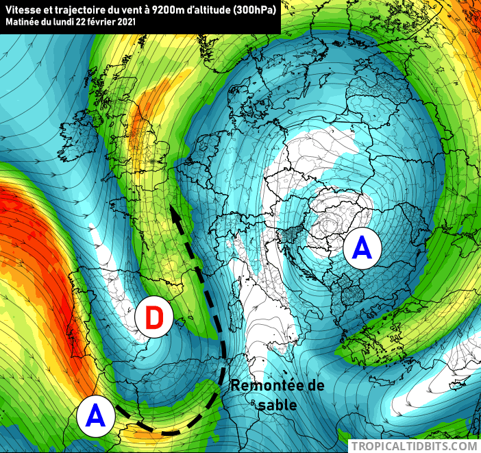 Vitesse et trajectoire du vent à 9200m d'altitude - matinée du lundi 22 février 2021 - TropicalTidbits