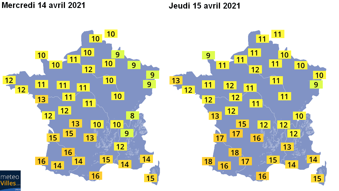 Températures maximales envisagées mercredi 14 et jeudi 15 avril 2021 – Météo-Villes