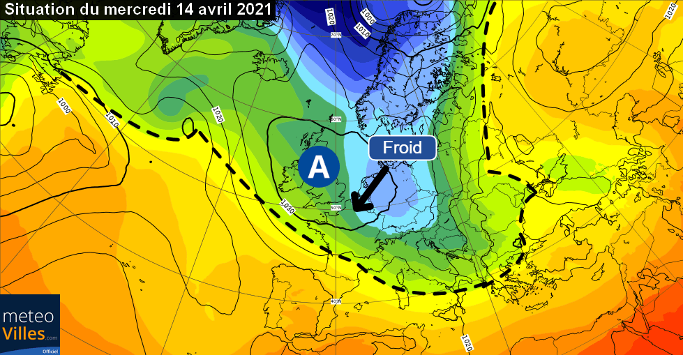 Schéma de la situation atmosphérique sur l’Ouest de l’Europe pour le mercredi 14 avril 2021 – ECMWF, modifié par Météo-Villes