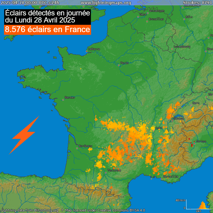 Éclairs détectés lors de la journée du lundi 28 avril 2025 - via lightningmaps.org