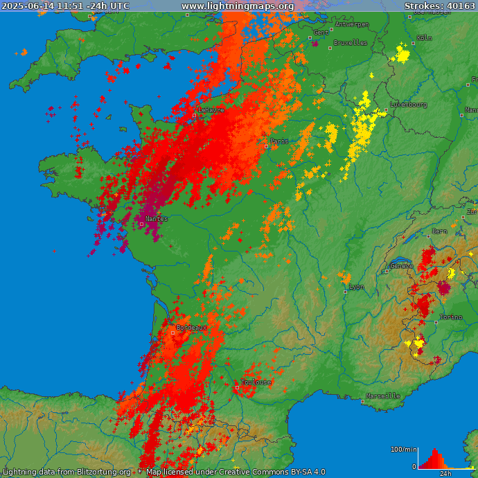 La dégradation orageuse a véritablement débuté en fin de journée du mercredi 11 juin sur la façade Atlantique. Après une journée parfois exceptionnellement chaude pour la période, des orages actifs sont remontés d'Espagne avec notamment une activité électrique marquée, de fortes pluies et des rafales de vent localement marquées.