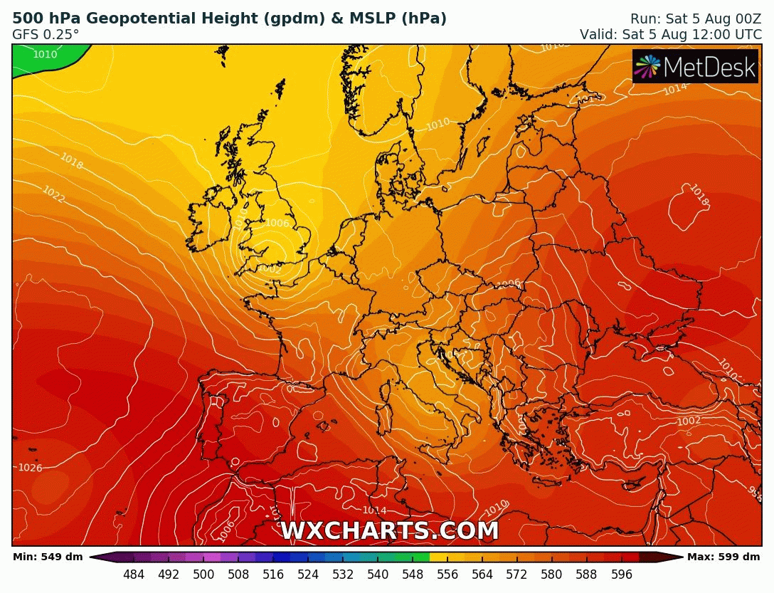 Animation des géopotentiels à 500 hPa du 5 au 13 août 2023 – Modèle GFS via WX CHARTS