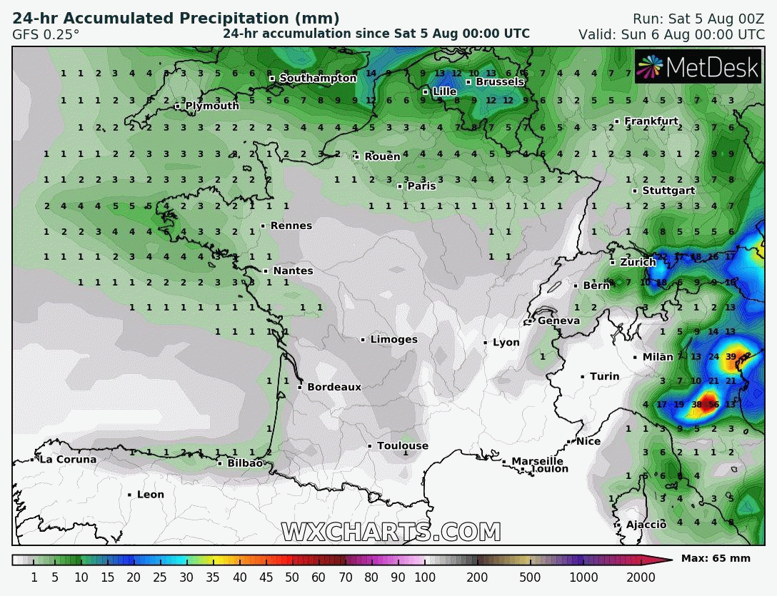 Animation des cumuls sur 24h du 5 au 13 août 2023 - Modèle GFS via WX CHARTS