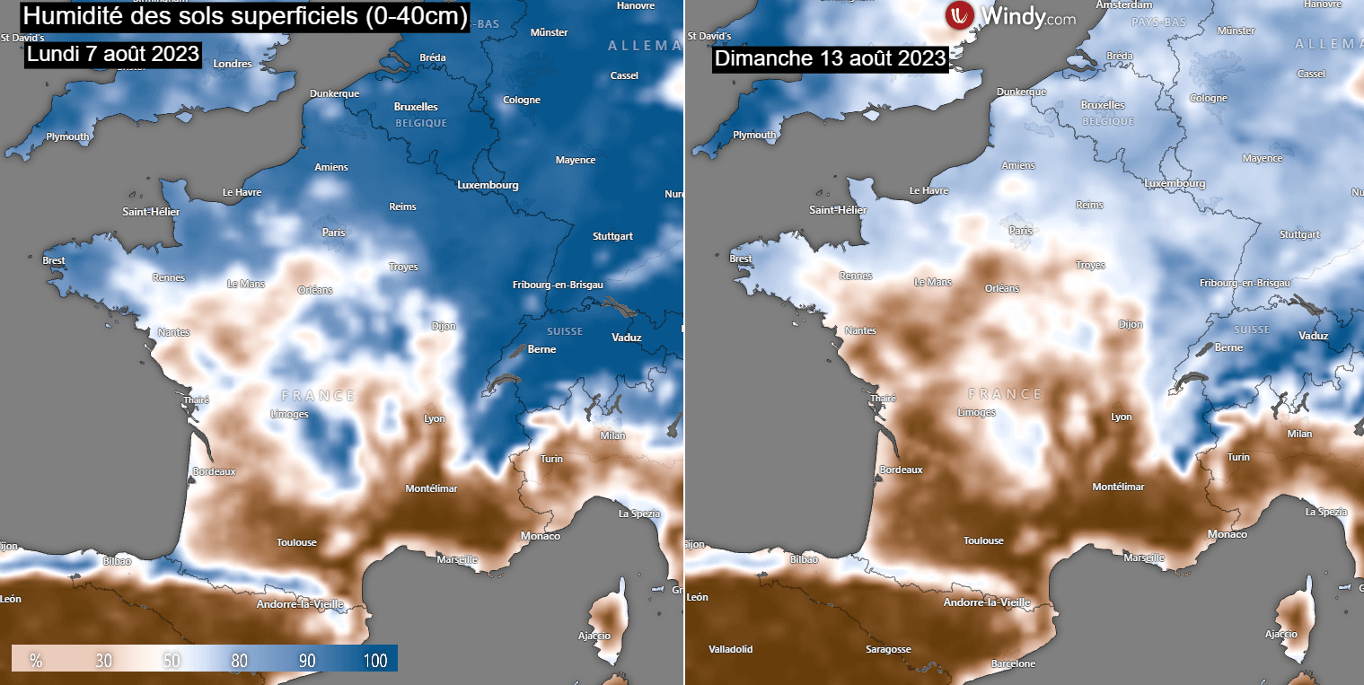 Evolution de l'indice d'humidité des sols entre le 7 et le 13 août 2023 – Windy