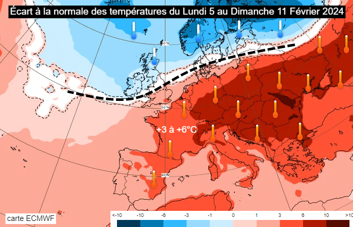 Anomalie thermique prévue en Europe entre le lundi 5 et le dimanche 11 février 2024 - carte ECMWF