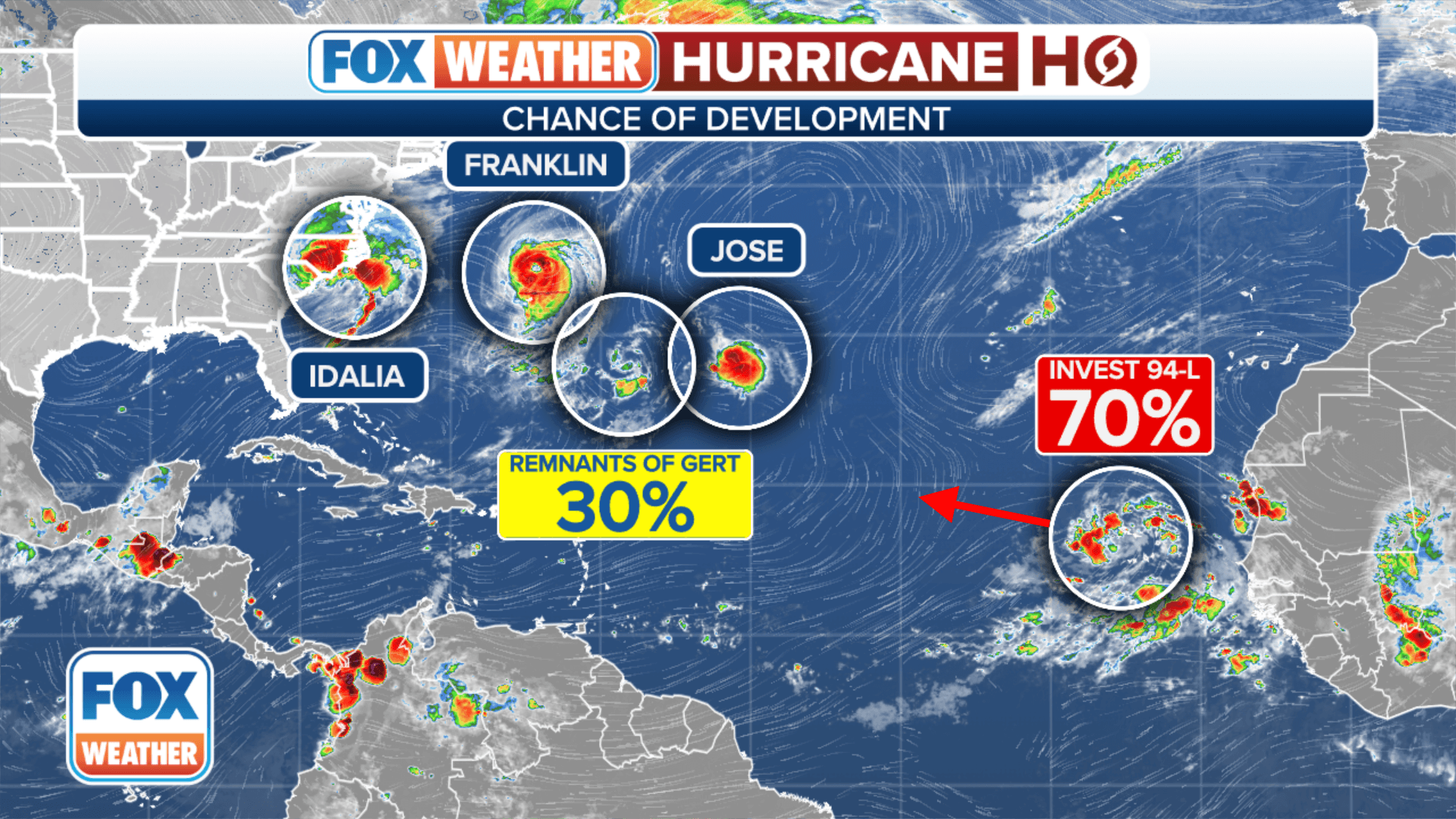Après avoir atteint temporairement la catégorie 4 avant de toucher terre sur la Floride, Idalia a été rétrogradée au stade de tempête tropicale ce jeudi 31 août 2023. Au dessus de l'Atlantique, l'ouragan Franklin poursuit sa route en direction du nord-est, sans représenter de menace pour les terres. Il était en catégorie 2 ce jeudi 31 août, après avoir atteint la catégorie 4 les 28 et 29 août. Par ailleurs, la tempête tropicale Jose circule actuellement plus au sud-est sur l'océan. On note aussi une onde tropicale (restes de la tempête tropicale Gert) plus au sud.