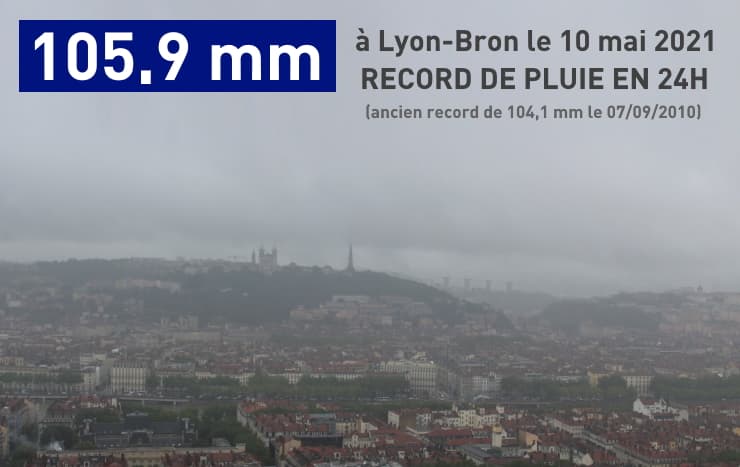 À Lyon, il est tombé 105,9 mm de pluie sur la seule journée du lundi 11 mai 2021 (de 6h à 6h UTC) ! Un tel cumul en seulement 24 heures n'avait jamais été observé sur la ville en plus d'un siècle de mesures ! Le dernier record datait du 7 septembre 2010. À l'époque, la capitale du Rhône avait reçu 104,1 mm en une journée.