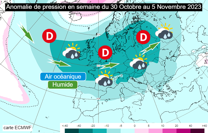 Anomalie de pression du lundi 30 octobre au dimanche 5 novembre 2023 – via ECMWF
