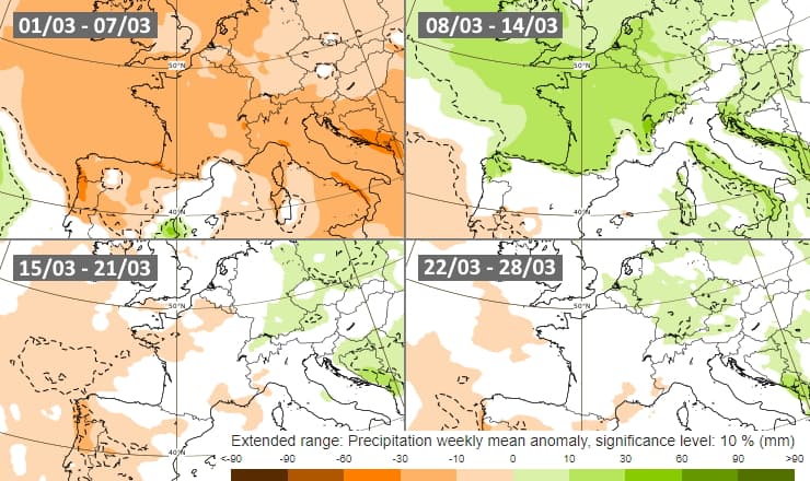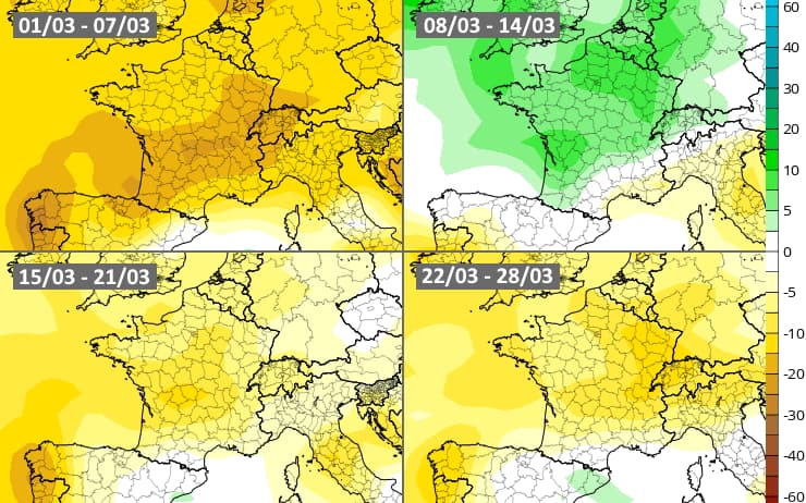 Le modèle européen met en évidence le caractère très sec de cette première semaine du mois de mars mais la tendance devrait s'inverser en milieu de semaine prochaine avec une séquence arrosée et venteuse à attendre (sauf vers la Méditerranée). Toutefois, de petites anomalies sèches reviendraient durant la seconde quinzaine du mois de mars, sans atteindre les niveaux du début de mois.