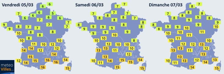 Prévisions des températures maximales du vendredi 5 au dimanche 7 mars 2021 - Météo Villes