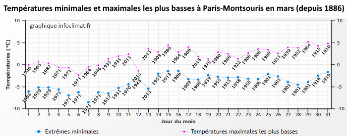 Températures minimales et maximales les plus basses mesurées à Paris-Montsouris en mars depuis 1886 - infoclimat.fr