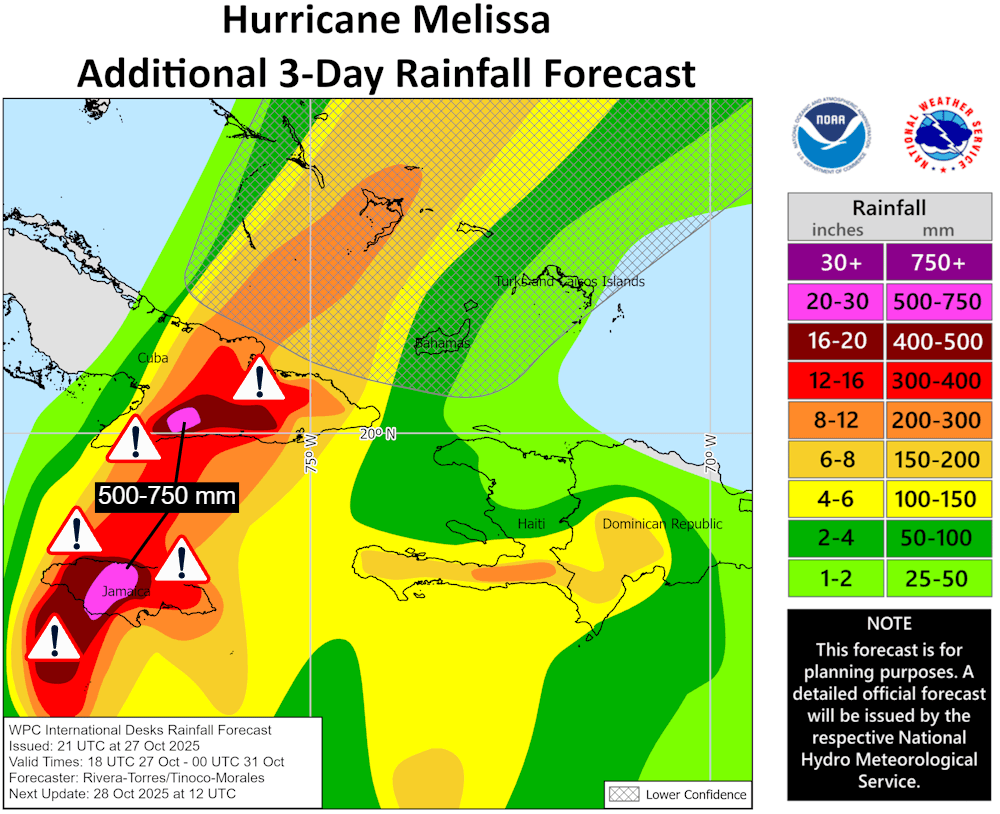Si les ouragans sont toujours associés à des précipitations diluviennes, le déplacement très lent de Melissa va évidemment amplifier le phénomène. Ainsi, les torrents de précipitations vont s'abattre de manière durable sur la Jamaïque puis sur le sud de Cuba. Le NHC américain s'attend à des quantités de pluie atteignant 500 à 750 mm sur le centre de la Jamaïque et dans certaines localités du sud de Cuba, soit 1 an de pluie sur Paris ! À Kingston en Jamaïque, il tombe en moyenne 850 mm par an, preuve que l'île n'est absolument pas prête à recevoir autant d'eau et va subir de graves inondations.