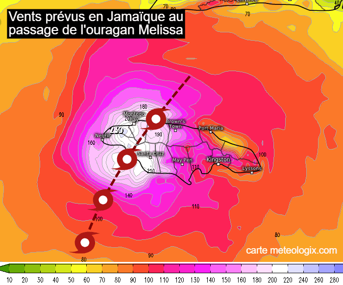 C'est la moitié ouest de la Jamaïque qui va subir les conséquences les plus graves avec des vents atteignant 200 à 250 km/h ! Outre la puissance remarquable des vents, leur durée constitue aussi un immense problème. En effet, Melissa se déplace particulièrement lentement, si bien que les vents destructeurs pourront souffler jusqu'à plus de 8 heures consécutives, une durée particulièrement longue et qui va évidemment amplifier les dégâts ! La seule "bonne" nouvelle est que la capitale Kingston - et ses plus de 900.000 habitants - se situe dans l'est de l'île et subira donc des vents moins dévastateurs que dans sa partie ouest.