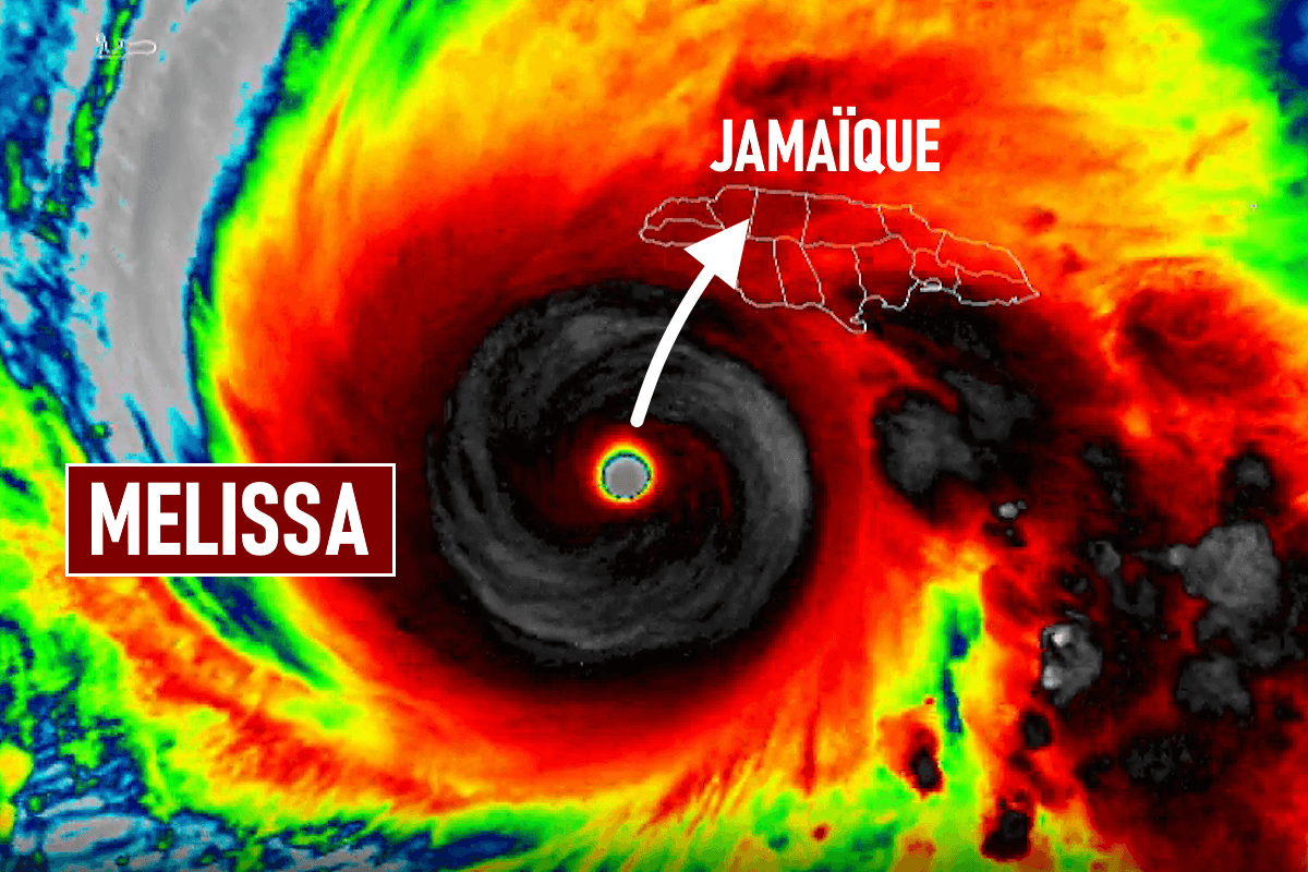 L'ouragan Melissa n'est pas un ouragan comme les autres. Il s'est développé depuis plusieurs jours au dessus des eaux chaudes de la Mer des Caraïbes et a atteint la catégorie 5, soit le niveau maximal. Comme le montre l'image satellite, il se rapproche dangereusement de la Jamaïque, qu'il atteindra par sa côte sud-ouest dans les prochaines heures. Sa structure est parfaite avec un œil symétrique et parfaitement dégagé, typique des ouragans majeurs.