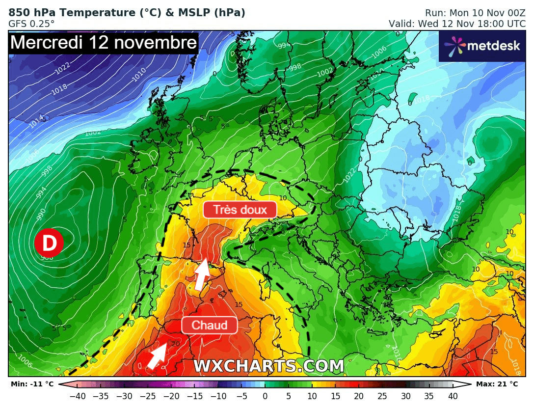 Situation atmosphérique du 12 novembre 2025 sur l'Europe – Modèle GFS via WX CHARTS