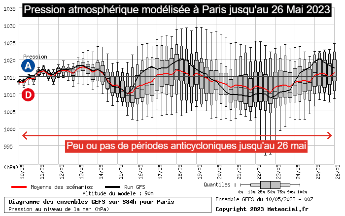 Lorsque l'on se penche sur les tendances à long terme, on constate qu'aucune amélioration concrète n'est en vue à l'heure actuelle. Ci-dessous, la moyenne des scénarios du modèle américain montre qu'aucune remontée notable des pressions n'est prévue sur Paris d'ici au 26 mai 2023. La courbe moyenne (en rouge) oscille plutôt entre 1010 et 1015 hPa, témoignant de la proximité d'anomalies instables et donc de conditions régulièrement humides sur l'hexagone.