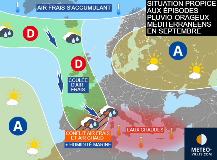 Lorsqu'arrive le mois de septembre, cela fait plus de deux mois que la durée du jour diminue. Aux hautes latitudes, l'air froid commence à s'accumuler, si bien que les flux de nord à nord-ouest ont de moins en moins de difficulté à nous amener un air très frais. Lorsque survient une coulée d'air frais venue du nord de l'Atlantique et que ce dernier atteint la Méditerranée, un gros conflit de masses d'air se produit, ce qui génère souvent des épisodes pluvio-orageux de forte intensité, causant parfois de gros dégâts.