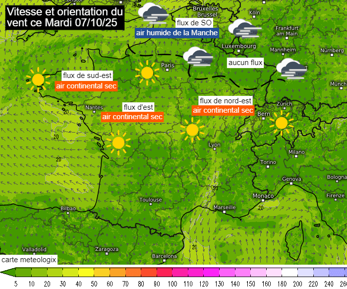 Dans ce cas, il faut se pencher sur l'orientation du flux pour comprendre. En effet, les hautes pressions ne font pas tout. D'ailleurs, le fait que les régions les plus septentrionales soient au plus près du cœur de l'anticyclone a joué en leur défaveur. En effet, on notait une absence totale de flux des Ardennes au nord de l'Alsace. N'étant nullement brassé, l'air restait donc humide en basses couches, facilitant le maintien des nuages bas. Sur l'extrême nord et la Belgique, un léger flux de sud-ouest était observé. Provenant de la Manche, ce dernier entretenait l'humidité, favorisant aussi le maintien de la grisaille. En revanche, c'est un flux continental (de nord-est, est ou sud-est) qui dominaient des régions centrales à la Bretagne, asséchant la masse d'air et créant un environnement défavorable aux nuages bas.