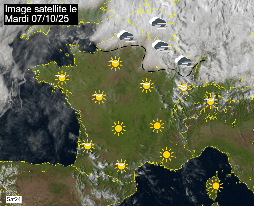 Si vous habitez les régions les plus au nord ou la Belgique, vous êtes probablement frustrés de ne pas bénéficier du soleil et de la douceur, alors même que vos baromètres affichent des pressions plus élevées que dans le sud de la France. Ce mardi 7 octobre 2025, seules les régions frontalières du nord sont restées sous la grisaille toute la journée, tandis que soleil et douceur régnaient sur une grande partie de la France, comme l'illustre l'image satellite ci-dessous.
