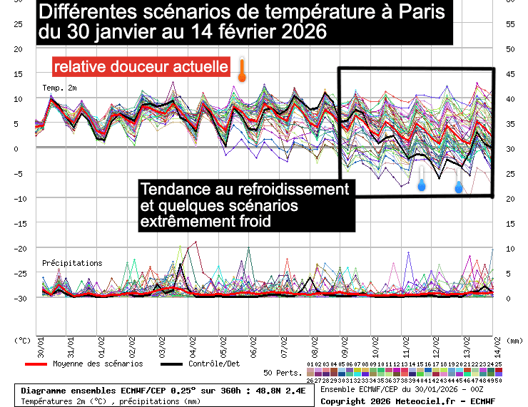 À partir du 9 février, la moyenne générale des scénarios indique une baisse des températures.  Cela ne signifie pas nécessairement que nous aurons un coup de froid, car les prévisions de ces derniers jours ont montré que ce refroidissement a été repoussé de jour en jour.  Néanmoins, la probabilité que l’air froid bascule sur nos régions est plus forte que l’inverse. Certains scénarios sont même extrêmement froids, et tout reste possible. À Paris, certaines prévisions indiquent des températures en dessous de 0° l’après-midi et jusqu’à -5 à -10°C le matin. Ces simulations ne sont pas si isolées que cela et reviennent régulièrement depuis quelques jours.