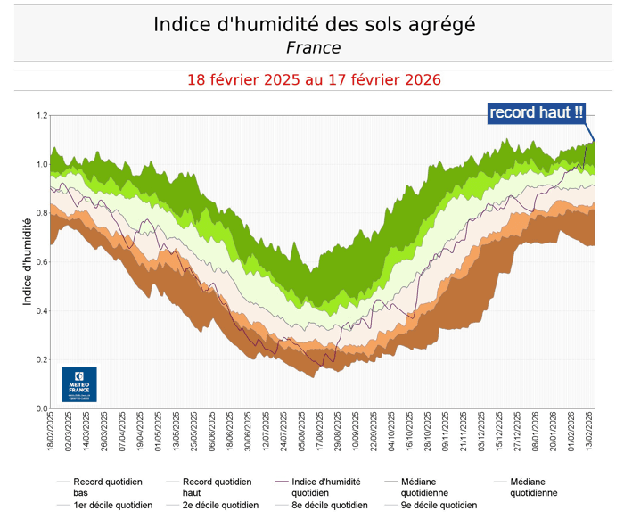 Autre indicateur qui permet de montrer que ce début d'année 2026 est véritablement exceptionnel : l'indice d'humidité des sols atteint des records. En effet, en date du 17 février 2026, l'indice moyenné à échelle nationale est à son plus haut niveau depuis le début des mesures pour cette époque de l'année. D'ailleurs, il arrive même sur le podium des situations où les sols ont été les plus humides en France, toutes dates confondues. Seuls décembre 1982 et janvier 1994, théâtres de graves inondations, avaient connu une humidité moyenne légèrement supérieure à la situation actuelle.