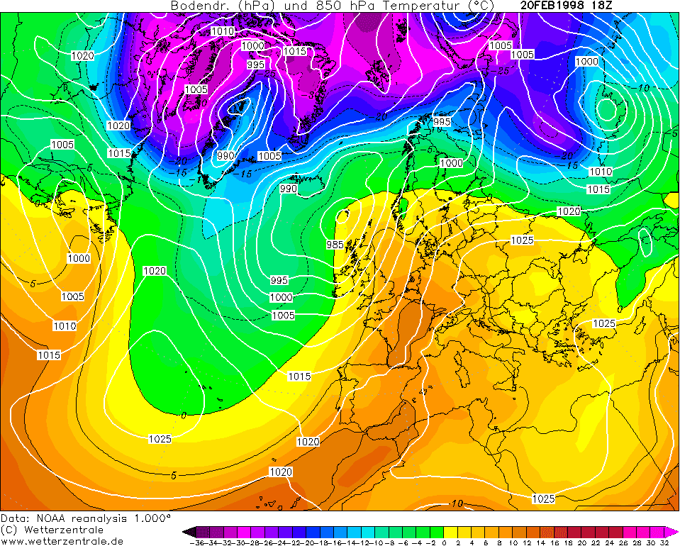 Réanalyse des masses d'air en altitude le 20 février 1998 - site Wetterzentrale.de