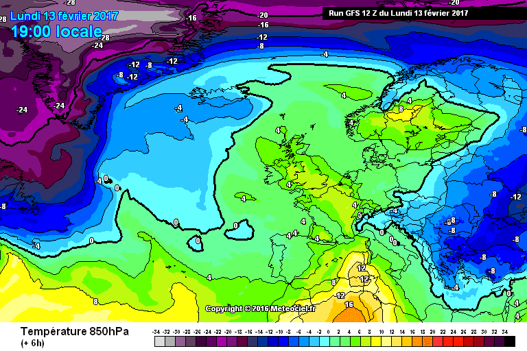 Températures à 850 hPa sur l'Ouest de l'Europe le 13 février 2017 - Modèle GFS via météociel.fr