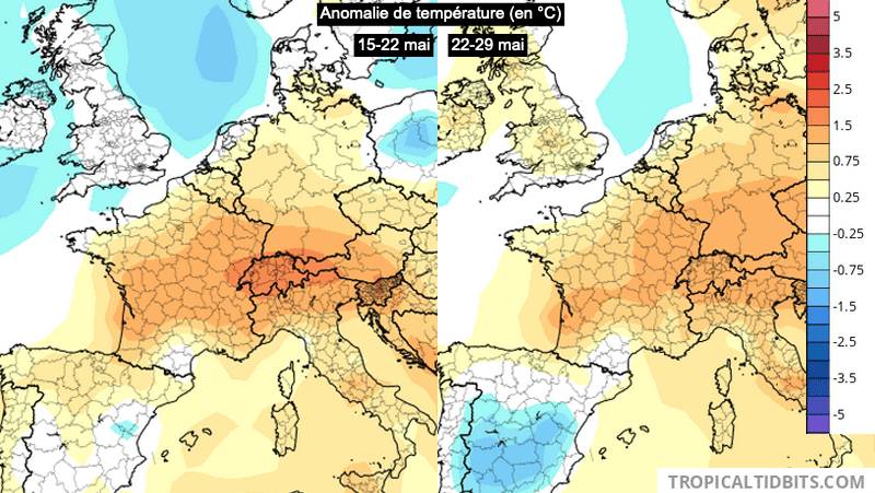 Anomalie de température (en °C) du 15 au 22 mai et du 22 au 29 mai - modèle CFS via TropicalTidbits