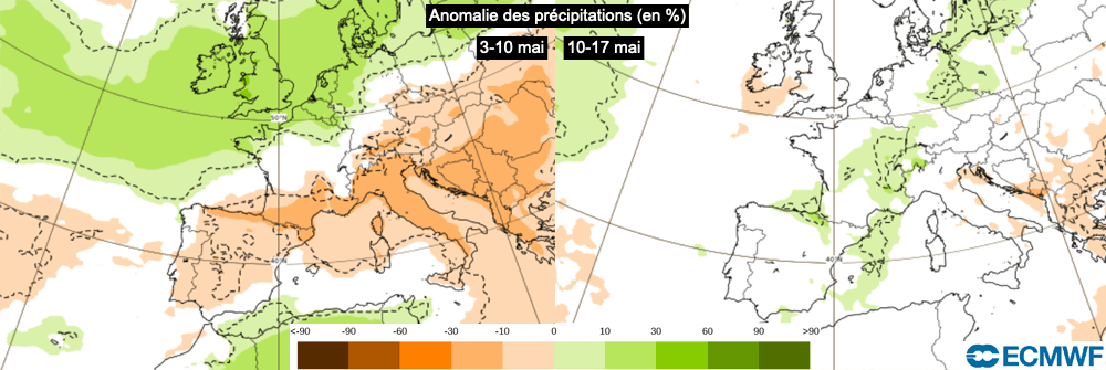 Anomalie des précipitations (en %) du 3 au 10 mai et du 10 au 17 mai - modèle CEP via ECMWF