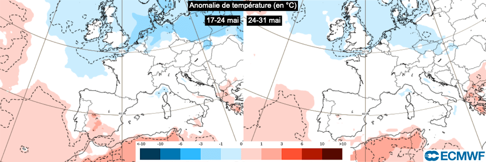 Anomalie de température (en °C) du 17 au 24 mai et du 24 au 31 mai - modèle CEP via ECMWF